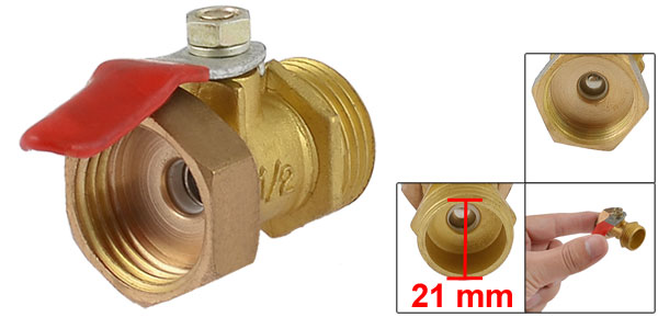 Product Name Ball Valve Type Full Port, Male to Female Handle Size 35 x 10 mm / 1.4" x 0.4" (L*W) Body Size 35 x 25 mm / 1.4" x 1" (L*W) Thread Size Male = Female = 21 mm / 1/2" PT Material Brass, Soft Plastic, Metal Color Brass Tone, Red Net Weight 44g Package Content 1 x Brass Ball Valve - Reviews