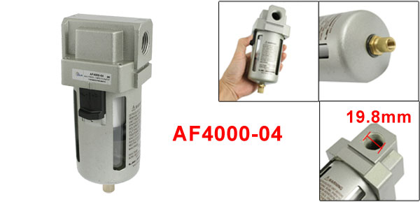 Product Name Pneumatic Compressed Air Filter Model AF4000-04 Material Metal, Plastic Working Medium Air Max. Pressure 1.0MPa / 10.2kgf/cm2 / 145psi Max. Temperature 50C / 140F Joint Pipe Thread Diameter 19.8mm Joint Pipe Size 1/2 PT Bottom Thread Diammeter 9mm Total Size 69 x 70 x 167mm/ 1.5" x 6.1" (L * W * H) Weight 476g Package Content 1 x Pneumatic Compressed Air Filter - Reviews