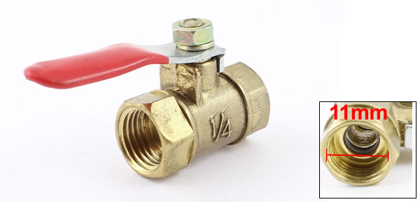 Product Name Lever Handle Ball Valve Type Female Thread Handle Size 25 x 11mm/1'' x 0.4'' (L*W) Body Size 29.4 x 11mm/1.16'' x 0.43'' (L*W) Female Thread Diameter 11mm Female Thread Size 1/4" PT Material Brass,Plastic Color Gold Tone, Red Net Weight 31g Package Content 1 x Lever Handle Ball Valve - Reviews