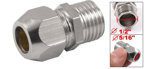 Product Name Compression Fitting Male Thread Size 12.6mm / 1/2"(0.496") Fit Tube 8mm / 5/16"(0.315") Overall Size 25 x 14 x 14mm / 0.98" x 0.55" x 0.55"(L*W*T) Color Silver Tone Material Brass & Metal Weight 25g Package Content 1 x Compression Fitting - Reviews