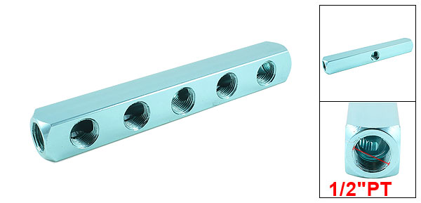 Product Name Manifold Block Thread Ports Quantity 8 Position Quantity 5 Color Teal Blue Material Aluminum Female Thread Size 1/2" PT Female Thread Dia. 21mm/ 0.8" Overall Size 220 x 29 x 29mm / 8.6" x 1.1" x 1.1" (L*W*H) Weight 325g Package 1 x Manifold Block - Reviews