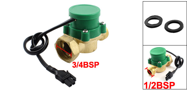 Main Color Gold Tone, Green Country of Manufacture CHINA Male Thread Dia 20mm/ 1/2BSP Female Thread Dia 25mm/ 3/4BSP Power 120W Material Metal, Plastic 2Pin Plug Connector Length 26cm/10.2" Product Name Water Flow Switch Net Weight 132g Rated Voltage DC 5-12V Package Content 1 x Water Flow Sensor Switch Max. Water Pressure 0.6Mpa Flow Characteristic 0.75-5L/min Body Size 64 x 39 x 56mm/2.5" x 1.6" x 2.2"(L*W*H) - Reviews