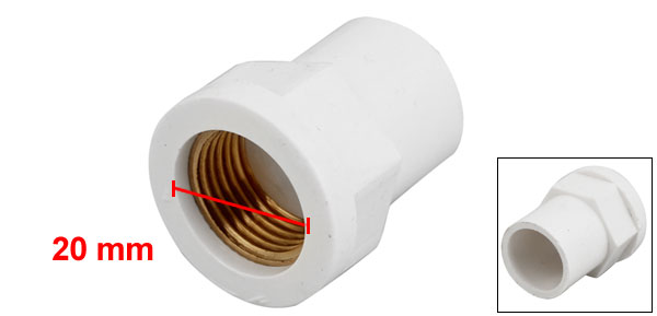 Product Name Connector Coupler End Inner Dia. 20 mm / 0.8" Female Thread Dia. 19 mm / 1/2PT Overall Size (Approx.) 3.7 x 3.2 cm / 1.5" x 1.3"(L*D) Material PVC-U, Brass Color White, Brass Tone Net Weight 21g Package Content 1 x Connector Coupler - Reviews