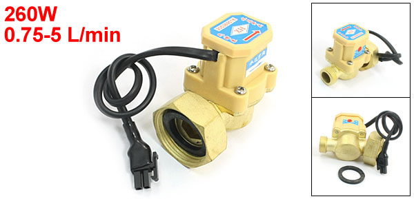 Product Name Water Flow Sensor Switch Max Load Power 260W Working Flow Rating 0.75-5 L/min Max Withstand Water Pressure <0.6Mpa Male Port Thread Dia 20mm/1/2PT Female Port Thread Dia 30mm /1PT Body Size 67 x 40 x 57mm / 2.7" x 1.6" x 2.3"(L*W) Cable Length 25cm /9.8" Material Brass Color Gold Tone Weight 200g Package Content 1 x Water Flow Sensor Switch - Reviews