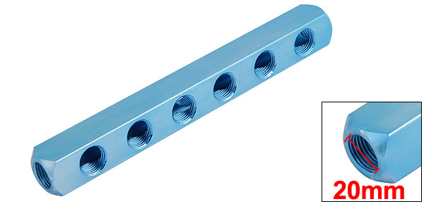 Product Name Manifold Block Thread Ports Quantity 7 Position Quantity 6 Color Teal Blue Material Aluminum Female Thread Size 1/2" NPT Female Thread Dia. 20mm/ 0.8" Overall Size 260 x 28 x 28mm / 10.2" x 1.1" x 1.1" (L*W*H) Weight 333g Package 1 x Manifold Block - Reviews