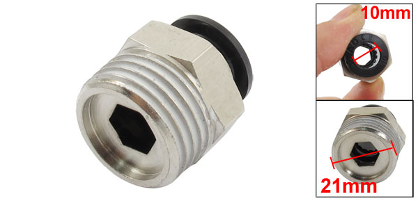 Item Name Quick Fitting Model JPC10-04 Material Metal, Plastic Color Silver Tone, Black Thread Size 1/2" PT Thread Diameter 21mm Inner Diameter(Black End) 10mm Total Size(Each) 24 x 24mm/ 0.9" x 0.9" (L*W) Weight 31g Package Content 1 x Quick Fitting - Reviews