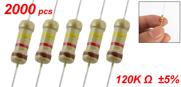 Details1/2W 120K Ohm 5% Axial Carbon Film Resistors 2000 Pcs  Product Name Carbon Film Resistor Material Type Carbon Film Rated Power 1/2W Resistance Value 120K Ω Tolerance ±5% Body Size (Each One) 8.5 x 3mm / 0.33" x 0.118" (L*D) Lead Size (Each End) 25 x 0.3mm / 0.98" x 0.012" (L*D) Total Length (Approx.) 58mm / 2.28" Color As Picture Shown Net Weight 490g Package Content 2000 Pcs (± 2%) x Carbon Film Resistors