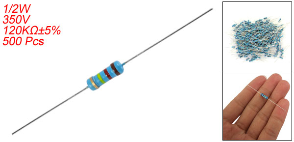 Details1/2W 120K ohms 5% Axial Carbon Film Resistors 500 Pcs  Product Name Carbon Film Resistors Rating Power 1/2W Resistance 120K Ohm Resistance Tolerance ± 5% Withstand Voltage 350V Size(Not Include Leads) 0.86 x 0.3cm / 0.338" x 0.118"(L*D) Leads Dia(Approx) 0.04cm / 0.016" Overall Length(Approx) 5.5cm / 2.2" Color See the Picture Weight 125g Package Content 500(±2%) Pcs of Carbon Film Resistors