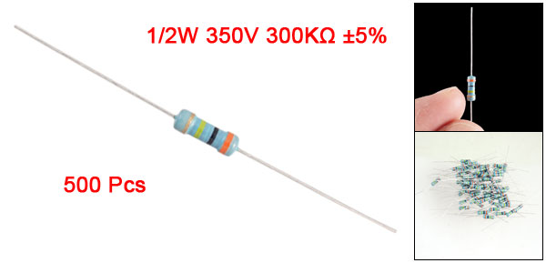 Product Name Carbon Film Resistor Lead Type Axial Power Rating 1/2W Resistance Tolerance ± 5% Resistance Value 300K Ohm Withstand Voltage 350V Size (Not Include Leads) 0.3 x 0.85cm / 0.12" x 0.33" (D*L) Leads Dia (Approx.) 0.03cm / 0.012" Total Length (Approx.) 5.6cm / 2.2" Color As Picture Show Weight 125g Package Content 500 Pcs (± 2%) x Carbon Film Resistors - Reviews