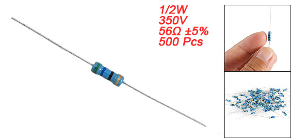 Product Name Carbon Film Resistor Lead Type Axial Power Rating 1/2W Resistance Tolerance ± 5% Resistance Value 56 Ohm Withstand Voltage 350V Size (Not Include Leads) 0.3 x 0.85cm / 0.12" x 0.33" (D*L) Leads Dia (Approx.) 0.03cm / 0.012" Total Length (Approx.) 5.6cm / 2.2" Color As Picture Show Weight 122g Package Content 500 Pcs (± 2%) x Carbon Film Resistors - Reviews