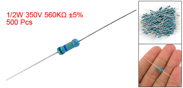 Product Name Carbon Film Resistors Rating Power 1/2W Resistance 560K Ohm Resistance Tolerance ± 5% Withstand Voltage 350V Size(Not Include Leads) 0.87 x 0.31cm / 0.342" x 0.122"(L*D) Leads Dia(Approx) 0.04cm / 0.016" Overall Length(Approx) 5.7cm / 2.2" Color See the Picture Weight 125g Package Content 500(±2%) Pcs of Carbon Film Resistors  - Reviews
