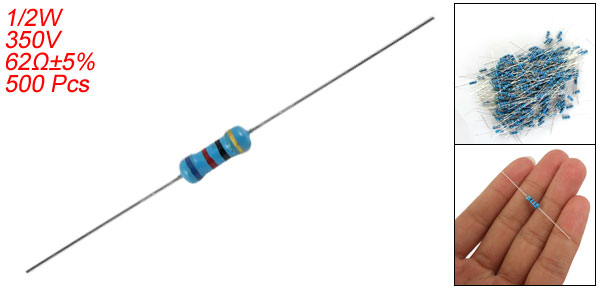 Product Name Carbon Film Resistors Rating Power 1/2W Resistance 62 Ohm Resistance Tolerance ± 5% Withstand Voltage 350V Size(Not Include Leads) 0.87 x 0.3cm / 0.343" x 0.118"(L*D) Leads Dia(Approx) 0.04cm / 0.016" Overall Length(Approx) 5.5cm / 2.2" Color See the Picture Weight 124g Package Content 500(±2%) Pcs of Carbon Film Resistors  - Reviews