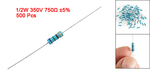 Product Name Carbon Film Resistors Rating Power 1/2W Resistance 750 Ohm Resistance Tolerance ± 5% Withstand Voltage 350V Size(Not Include Leads) 0.6 x 0.25cm / 0.236" x 0.098"(L*D) Leads Dia(Approx) 0.04cm / 0.016" Overall Length(Approx) 5.6cm / 2.2" Color See the Picture Weight 127g Package Content 500(±2%) Pcs of Carbon Film Resistors - Reviews