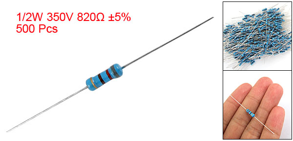 Product Name Carbon Film Resistors Rating Power 1/2W Resistance 820 Ohm Resistance Tolerance ± 5% Withstand Voltage 350V Size(Not Include Leads) 0.85 x 0.3cm / 0.335" x 0.118"(L*D) Leads Dia(Approx) 0.04cm / 0.016" Overall Length(Approx) 5.5cm / 2.2" Color See the Picture Weight 119g Package Content 500(±2%) Pcs of Carbon Film Resistors - Reviews