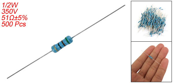 Product Name Carbon Film Resistors Rating Power 1/2W Resistance 51 Ohm Resistance Tolerance ± 5% Withstand Voltage 350V Size(Not Include Leads) 0.86 x 0.3cm / 0.338" x 0.118"(L*D) Leads Dia(Approx) 0.04cm / 0.016" Overall Length(Approx) 5.5cm / 2.2" Color See the Picture Weight 127g Package Content 500(±2%) Pcs of Carbon Film Resistors - Reviews