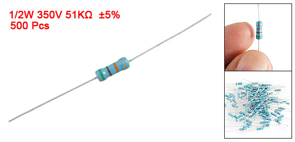 Product Name Carbon Film Resistors Material Type Carbon Film Rated Power 1/2W Resistance Value 51K Ohm Tolerance ±5% Withstand Voltage 350V Size(Not included Leads) 0.6 x 0.25cm / 0.236" x 0.098" (L * D) Lead Dia(Approx) 0.02cm / 0.007" Overall Length(Approx) 5.5cm/2.2" Color As Picture Shown Weight 125g Package Content 500 Pcs (± 2%) x Carbon Film Resistors - Reviews