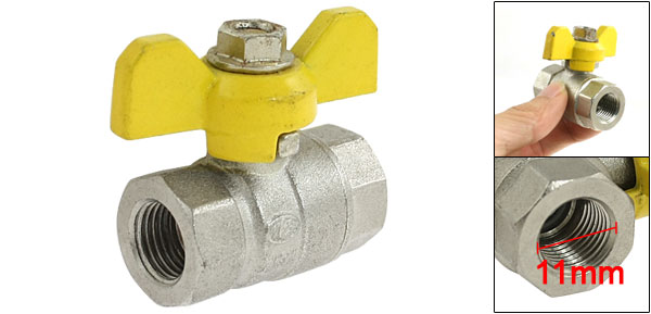 Details1/4" NPT Female to Female Full Port Tee Handle Ball Valve  Product Name Ball Valve Material Metal Color Silver Tone, Yellow Inner Valve Hole Dia. 10mm/0.39'' Thread Dia. 1/4" NPT to1/4" NPT Female (11mm to 11mm) Level Handle Size 47 x 21mm/1.9'' x 0.8'' (L*W) Overall Size 47 x 21 x 43mm/1.9'' x 0.8'' x 1.7'' (L*W*H) Net Weight 100g Package Contents 1 x Ball Valve