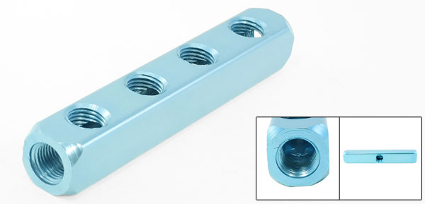 Product Name Manifold Block Threaded Ports Quantity 7 Position Quantity 4 Color Turquoise Material Aluminum Thread Type 1/4" PT Female Thread Dia. 13mm Overall Size 125 x 20 x 20mm / 4.9" x 0.8" x 0.8" (L*W*H) Weight 88g Package 1 x Manifold Block - Reviews