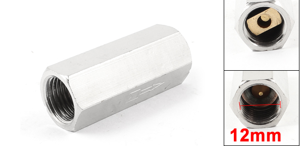 Product Name One Way Air Check Valve Color Silver Tone Thread Size 1/4" PT Thread Diameter 12mm Size 40 x 18mm/ 1.6" x 0.7" (L*D) Material Metal Weight 40g Package 1 x One Way Air Check Valve - Reviews