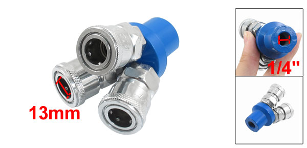 Product Name Quick Coupler Material Metal Color Silver Tone, Blue Air Outlet 3 Way Connector Diameter 13mm Thread Diameter 13mm Thread Size 1/4" PT Overall Size(Approx.) 70 x 60 x 36mm/2.8'' x 2.4'' x 1.4' (L*W*H) Weight 243g Package Content 1 x 3 Way Quick Coupler - Reviews