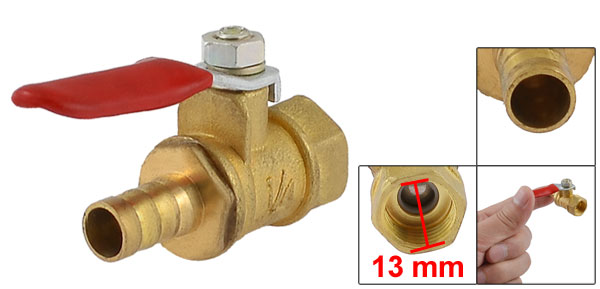 Product Name Ball Valve Type Female Thread to Hose Barb Female Thread Diameter 13 mm / 1/4" PT Hose Barb Outside Dia. 8 mm / 0.3" Level Handle Size 35 x 10 mm / 1.4" x 0.4" (L*W) Body Size 40 x 23 mm / 1.6" x 0.9" (L*W) Color Brass Tone, Red Material Brass, Metal, Soft Plastic Net Weight 33g Package 1 x Brass Ball Valve - Reviews