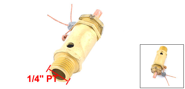 Details1/4" PT Male Thread Air Compressor Safety Pressure Relief Valve  Product Name Pressure Relief Valve Male Thread Diameter 13.2mm/ 1/4" PT Overall Size 57x 17mm/ 2.24" x 0.67"(L*Max.D) Material Brass Color Gold Tone Weight 45g Package Content 1 x Pressure Relief Valve