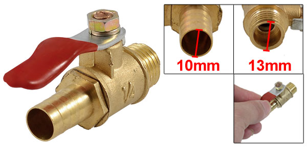 Product Name Ball Valve Male Thread Dia 13mm/ 1/4" PT Hose Tail Dia 10mm/ 0.38" Level Handle Size 45 x 11mm/ 1.8" x 0.43" (L*W) Total Size 57 x 17 x 30mm/ 2.3" x 0.7" x 1.2" (L*W*H) Color Gold Tone & Red & Silver Tone Material Solid Brass Weight 30g Package 1 x Ball Valve - Reviews