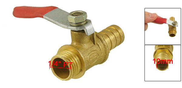 Product Name Ball Valve Male Thread Diameter 1/4" PT Ball Hole Diameter 6mm/ 0.24" Hole Tail OD 10mm Level Handle Size 48 x 11mm/ 1.9" x 0.43" (L*W) Overall Size 48 x 41 x 27mm/ 1.9" x 1.6" x 1"(L* W*H) Main Color Gold Tone & Red Material Metal, Brass, Plastic Weight 29g Package 1 x Ball Valve - Reviews