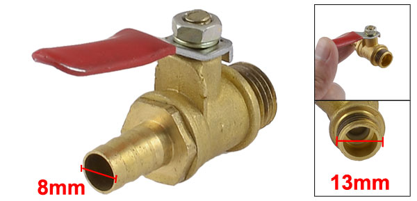 Product Name Ball Valve Type Male Thread to Hose Barb Male Thread Diameter 13 mm / 1/4" PT Hose Barb Outside Dia. 8 mm / 0.3" Level Handle Size 35 x 10 mm / 1.4" x 0.4" (L*W) Body Size 40 x 23 mm / 1.6" x 0.9" (L*W) Color Brass Tone, Red Material Brass, Metal, Soft Plastic Net Weight 29g Package 1 x Brass Ball Valve - Reviews
