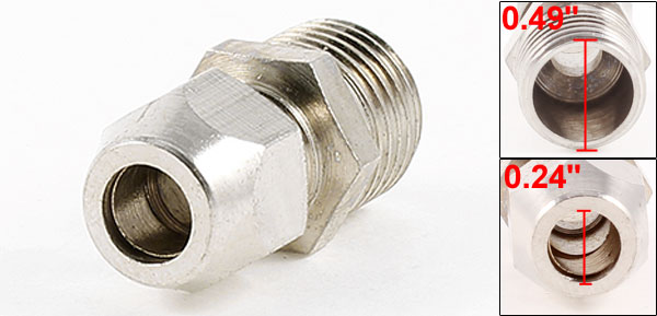 Product Name Quick Coupler Male Thread Diameter 12.5mm / 0.49" Fit Tube Outside Dia. 6mm / 0.24" Overall Size 26 x 9.5mm / 1.02" x 0.37" (Min L*Max W) Color Silver Tone Material Metal Weight 11g Package Content 1 x Quick Coupler - Reviews