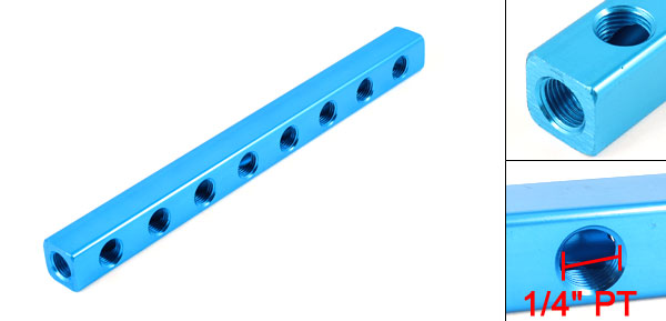 Product Name Manifold Block Thread Ports Quantity 11 Position Quantity 8 Color Teal Blue Material Aluminum Female Thread Size 1/4" PT Female Thread Dia. 12mm/ 0.47" Overall Size 235 x 20 x 20mm / 9.3" x 0.7" x 0.7" (L*W*H) Weight 159g Package 1 x Manifold Block - Reviews