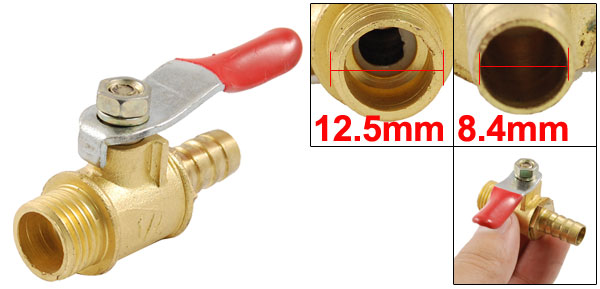 Product Name Ball Valve Thread Diameter 1/4" PT (12.5mm) Hose Tail OD 8.4mm/ 3/10'' Level Handle Size 45 x 11mm/1.77'' x 0.43'' (L*W) Overall Size 55 x 15 x 30mm/2.2'' x 0.6'' x 1.18'' (L*W*H) Color Gold Tone & Red & Silver Tone Material Solid Brass Weight 32g Package 1 x Ball Valve - Reviews