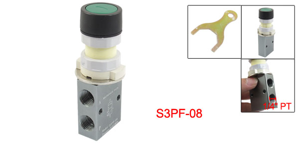 Product Name Mechanical Valve Model S3PF-08 Operation Type Direct Acting Contact Type Momentary Working Medium Clear Air (40µm filteration) Port Type 3 Position Type 2 Joint Pipe Size 1/4" PT Thread Inside Diameter 12.8mm Mounting Hole 22mm Operating Temperature Range -5 ~ 60°C Working Pressure Range 0 ~ 0.8MPa Total Size(Approx) 3.6 x 2.8 x 9.4cm / 1.4"x 1.1"x 3.7" (L*W*H) Material Alloy Main Color Gray, Black, Green Net Weight 134g Package Content 1 x Mechanical Valve 1 x Small Fork - Reviews