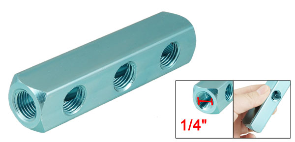 Product Name Manifold Block Threaded Ports Quantity 6 Ports Position 3 Color Sky Blue Material Aluminum Threaded Port Dia 1/4" PT Overall Size 95 x 20 x 20mm / 3.7" x 0.8" x 0.8" (L*W*H) Weight 64g Package 1 x Manifold Block - Reviews