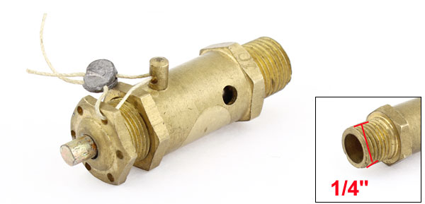 Details1/4" Thread Metal Safety Pressure Relief Valve Gold Tone for Air Compressor  Product Name Pressure Relief Valve Material Metal Color Gold Tone Thread Diameter 13mm/1/4"PT Valve Total Size 5.8 x 1.7cm/ 2.3" x 0.67"(L*W) Weight 53g Package Content 1 x Pressure Relief Valve