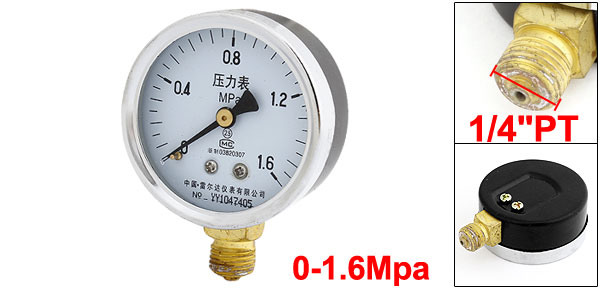 Product Name Pressure Gauge Pressure Range 0-1.6Mpa Accuracy 2.5 Thread Diameter 13mm/ 1/4"PT Case Size (Approx) 60 x 27mm / 2.4" x 1.1" (D*T) Total Length 80mm/ 3.1" Material Metal, Plastic Main Color Silver Tone, Black Net Weight 101g Package Content 1 x Pressure Gauge - Reviews