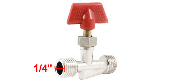Details1/4"PT to 1/4"PT Male Thread Connector Red Plastic Handle Gas Valve  Product Name Gas Valve Design T Shape, Male to Male Thread Thread Size 1/4" PT to 1/4" PT Handle Size 28 x 17mm/ 1.1" x 0.7" (L*W) Overall Size 41 x 50mm/ 1.6" x 2" (L*H) Color Red , Silver Tone Material Metal , Plastic Weight 24g Package 1 x Gas Valve