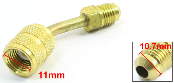 Product Name Pipe Quick Connect Adapter for Air Conditioner Model 410A Plastic Hole Inner Dia 5mm/0.2" Female Thread Dia. 11mm/1/4NPT Male Thread Diameter 10.7mm / 1/4NPT Total Size 6.3 x 1.6cm / 2.5" x 0.63"(D*H) Material Brass Color Gold Tone Net Weight 35g Package Content 1 x Pipe Quick Connect Adapter - Reviews
