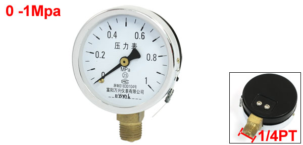 Product Name Pressure Gauge Pressure Intensity 0 -1Mpa Accuracy Class Class 2.5 Thread Diameter 1/4PT Case Size 6 x 2.8cm/ 2.4" x 1.1" (D*T) Main Color Black, Silver Tone, Gold Tone Material Metal Weight 113g Package 1 x Air Pressure Gauge - Reviews