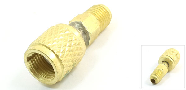 Product Name Pipe Quick Connect Adapter for Air Conditioner Model 410A Rotation Angle 180º Design Adjustable Plastic Hole Thread Dia 5mm/0.2" Female Thread Dia. 11mm/1/4PT Male Thread Diameter 11mm / 1/4PT Total Size 1.8 x 4.5cm / 2.8" x 1.8"(D*H) Material Brass Color Gold Tone Net Weight 40g Package Content 1 x Pipe Quick Connect Adapter - Reviews