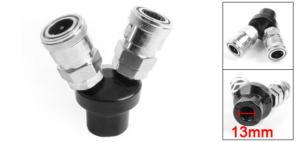 Product Name Quick Coupler Material Metal Color Silver Tone, Black Air Outlet 2 Way Connector Diameter 13mm Thread Diameter 13mm Thread Size 1/4" PT Overall Size(Approx.) 70x 70 x 37mm/2.75'' x 2.75'' x 1.45'' (L*W*H) Weight 92g Package Content 1 x 2 Way Quick Coupler - Reviews