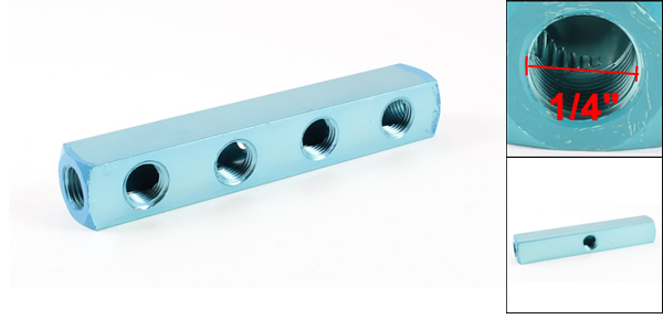 Product Name Manifold Block Threaded Ports Quantity 7 Ports Color Sky Blue Position 4 Material Aluminum Threaded Port Dia 1/4" PT Overall Size 125 x 20 x 20mm / 4.9" x 0.8" x 0.8" (L*W*H) Weight 88g Package 1 x Manifold Block - Reviews