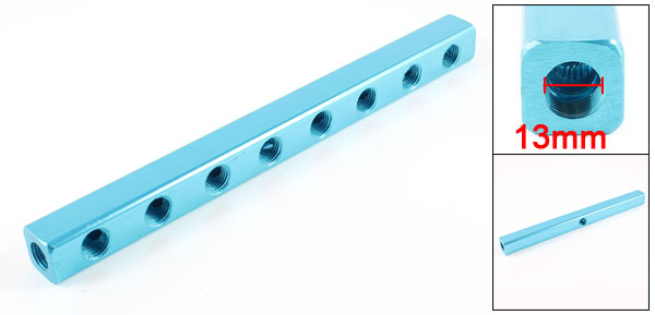 Product Name Manifold Block Thread Ports Quantity 11 Position Quantity 8 Color Teal Blue Material Aluminum Female Thread Size 1/4" PT Female Thread Dia. 13mm/ 0.5" Overall Size 245 x 20 x 20mm / 9.6" x 0.7" x 0.7" (L*W*H) Weight 194g Package 1 x Manifold Block - Reviews