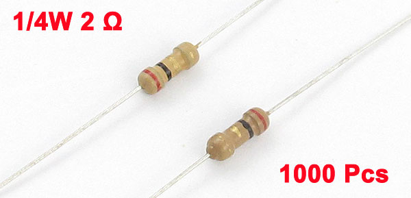 Product Name Carbon Film Resistor Lead Type Axial Power Rating 1/4W Resistance Tolerance ± 5% Resistance Value 2 Ohm Body Size 6 x 2mm/ 0.24" x 0.08" (L*D) Leads Dia (Approx.) 0.6mm / 0.024" Total Length (Approx.) 58mm / 2.3" Weight 100g Package Content 1000(±2%) Pcs x Carbon Film Resistors - Reviews