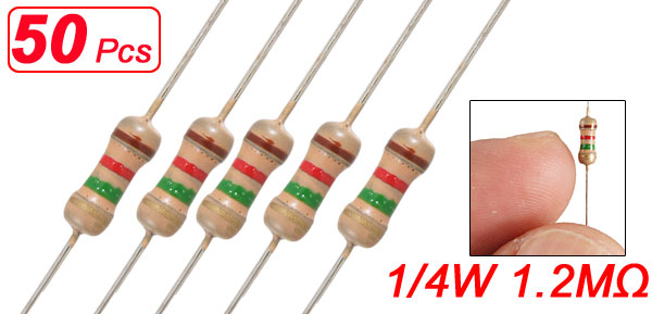 Product Name Resistor Resistor Type Carbon Film Rated Power 1/4 W Resistance Value 1.2MΩ Tolerance ± 5% Withstang Voltage 250V Body Size (Approx.) 5 x 2mm/0.2'' x 0.08'' (L*D) Lead Size (Each End) 20 x 0.4mm / 0.8" x 0.016" (L*D) Total Length 45mm/1.8'' Color As Picture Shown Weight 5g Package Content 50(±2%) x Carbon Film Resistors - Reviews