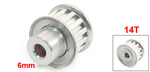 Product Name Timing Pulley Type XL14 Number of Tooth 14T Pitch 5.08mm/1/5'' Bore Diameter 6mm/0.24" Top Diameter 14mm/0.55" Overall Size 25 x 26mm/1'' x1''(D*H) Fit Belt Width 11mm/0.43" Materials Alumnum Color Silver Tone Weight 33g Package Content 1 x Timing Pulley - Reviews