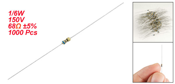 Product Name Carbon Film Resistors Rating Power 1/6W Resistance 68 Ohm Resistance Tolerance ± 5% Withstand Voltage 150V Size(Not Include Leads) 0.32 x 0.16cm / 0.126" x 0.063"(L*D) Leads Dia(Approx) 0.03cm / 0.012" Overall Length(Approx) 4.7cm / 1.85" Color See the Picture Weight 56g Package Content 1000(±2%) Pcs of Carbon Film Resistors - Reviews