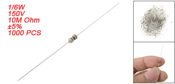 Product Name Carbon Film Resistors Quantity 1000±2%Pcs Rating Power 1/6W Resistance 10M Ohm Resistance Tolerance ± 5% Withstang Voltage 150V Size(Not Include Leads) 1.7 x 3mm/ 0.066" x 0.118"(D*L) Leads Dia(Approx) 0.3mm/ 0.012" Overall Length(Approx) 47mm/ 1.8" Color As Picture Show Weight 56g Package Content 1000 x Carbon Film Resistors - Reviews