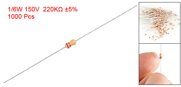 Product Name Carbon Film Resistors Rating Power 1/6W Resistance 220K Ohm Resistance Tolerance ± 5% Withstand Voltage 150V Size(Not Include Leads) 0.18 x 0.36cm / 0.07" x 0.14"(D*L) Leads Dia(Approx) 0.03cm / 0.012" Overall Length(Approx) 4.6cm / 1.8" Color As Picture Shown Weight 57g Package Content 1000(±2%) Pcs of Carbon Film Resistors - Reviews