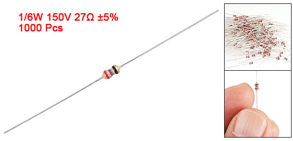 Product Name Carbon Film Resistors Rating Power 1/6W Resistance 27 Ohm Resistance Tolerance ± 5% Withstand Voltage 150V Size(Not Include Leads) 0.36 x 0.17cm / 0.142" x 0.067"(L*D) Leads Dia(Approx) 0.03cm / 0.012" Overall Length(Approx) 4.55cm / 1.8" Color See the Picture Weight 57g Package Content 1000(±2%) Pcs of Carbon Film Resistors - Reviews
